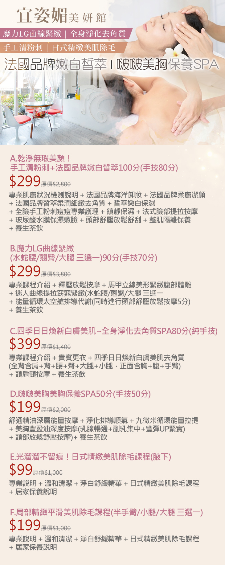 A.乾淨無瑕美顏!手工清粉刺+法國品牌嫩白皙萃100分(手技80分) / B.魔力LG曲線緊緻(水蛇腰/翹臀/大腿 三選一)90分(手技70分) / C.四季日日煥新白膚美肌~全身淨化去角質SPA80分(純手技) / D.啵啵美胸美胸保養SPA50分(手技50分) / E.光溜溜不留痕!日式精緻美肌除毛課程(腋下) / F.局部精緻平滑美肌除毛課程(半手臂/小腿/大腿 三選一)