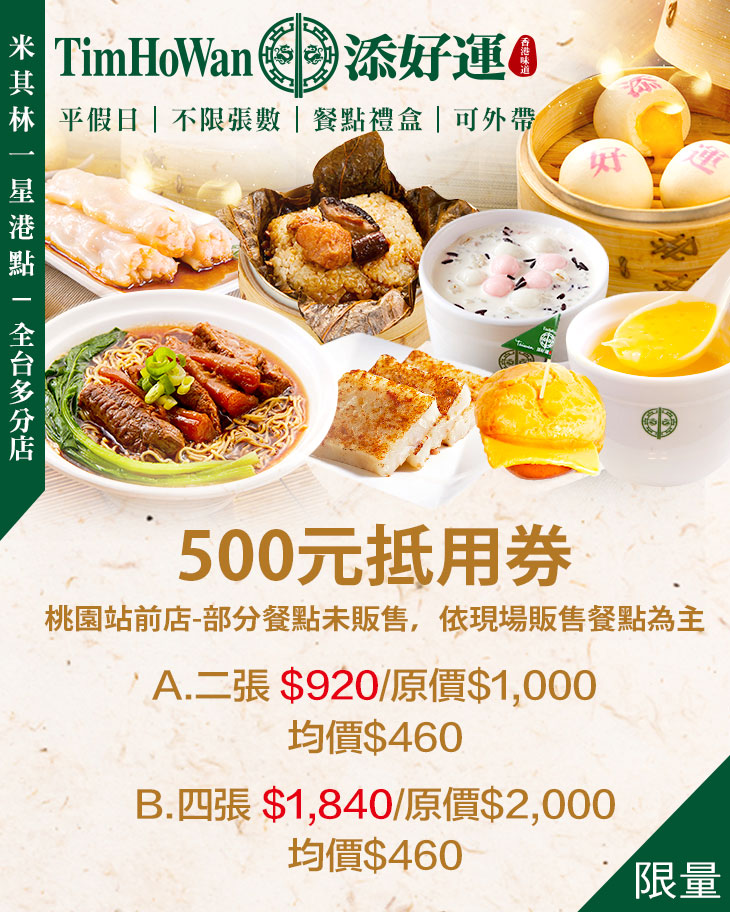 大家還記得這從香港來台頂級一流的熱門港點,ㄧ開幕便吸引大批人群排隊,無論任何時段,人潮總是絡繹不絕,從每個人臉上的神情就可以看出大家有多迫不及待想吃到這榮獲米其林肯定的傳奇風味!平假日不限使用張數,餐點禮盒皆可使用!讓您以平實價格品嚐香港最知名港點的色香味!
