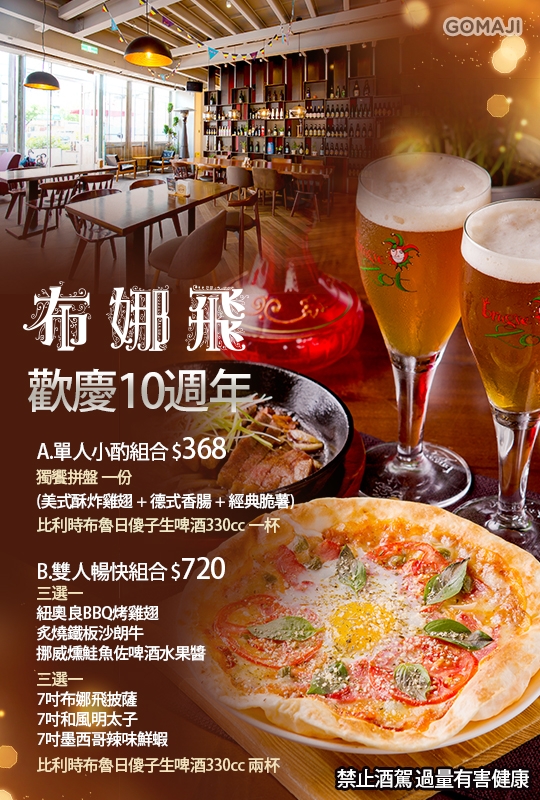 【布娜飛比利時啤酒餐廳(台中公益店)】有120多支的比利時啤酒,有薄皮脆餅的手工石窯披薩,有精心烹調的義大利麵、燉飯、排餐,有適合下酒的各式拼盤,甚至連美式早午餐都有!這回歡慶開幕屆滿10週年!再度與GOMAJI攜手合作推出美味雙重方案!368元即可享有單人歡樂組合、720元就能品味雙人暢快組合!