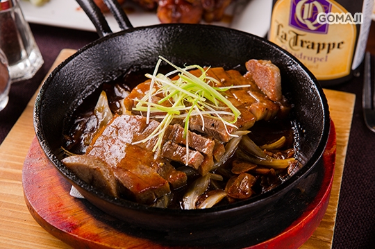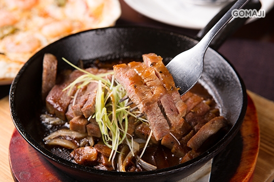 沙朗牛排微微煎過,利用蒜味奶油提味,淋上蘑菇牛肉醬汁與蒜片點綴,而鐵板炙燒的風味濃厚,十分適合搭配啤酒享用!