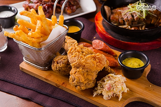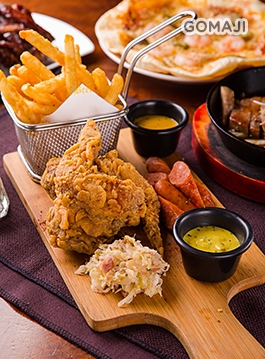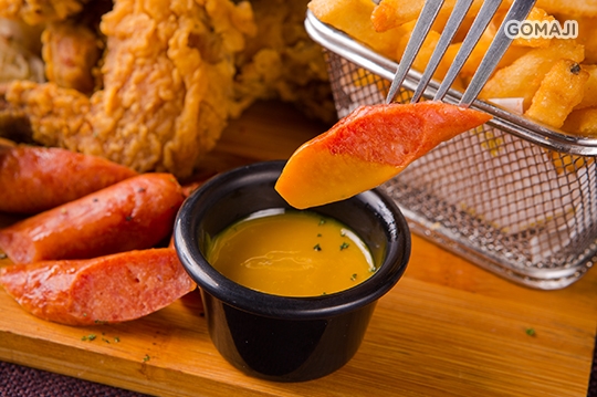 今夏消暑特製拼盤!美式酥炸雞翅、德式香腸、經典脆薯佐蜂蜜芥末醬,三種口味一次同時滿足,搭配冰涼生啤酒,爽快開懷啊!
