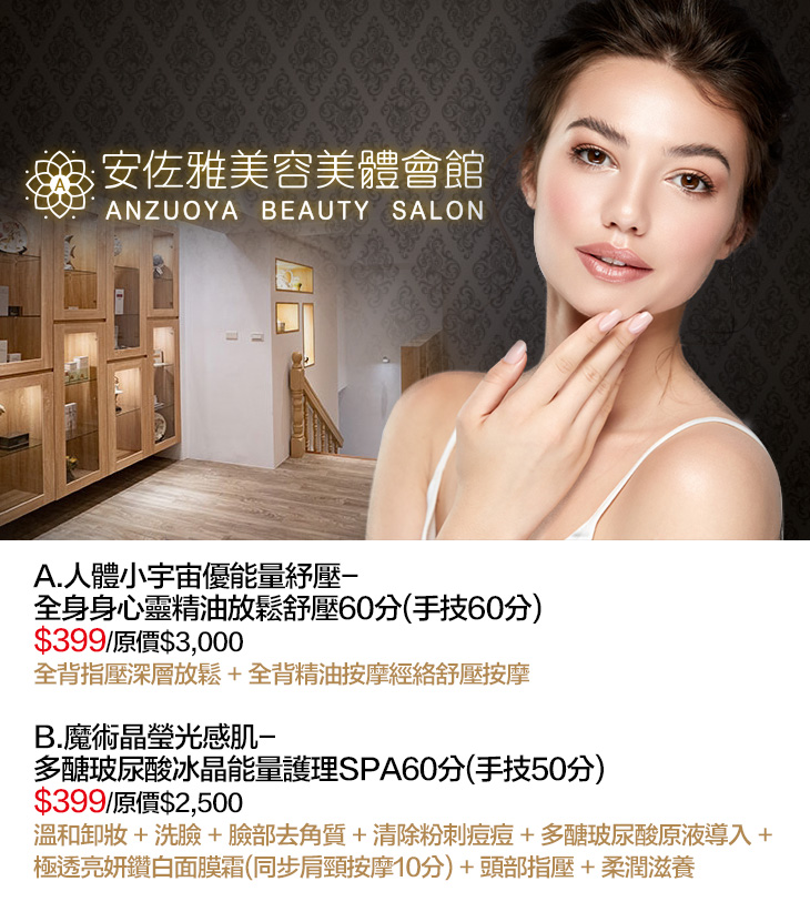 A.人體小宇宙優能量紓壓-全身身心靈精油放鬆舒壓60分(手技60分) / B.魔術晶瑩光感肌-多醣玻尿酸冰晶能量護理SPA60分(手技50分)