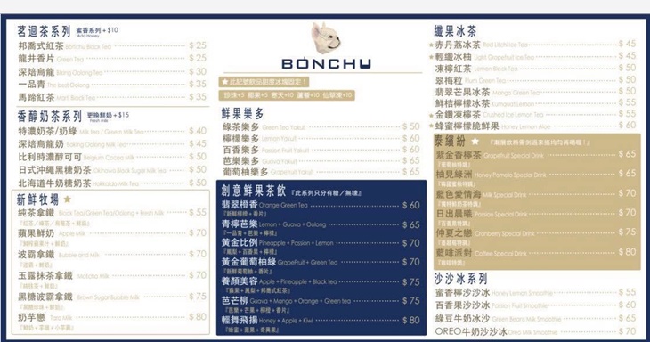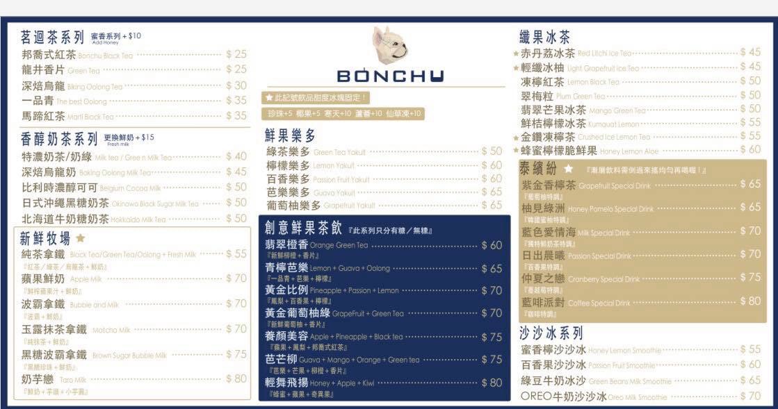 以法國鬥牛犬為主題的飲品店,店家夫妻倆為了紀念逝去的愛犬BONCHu,決定延續BONCHu的精神,於是有了這間創意茶飲。店內不只可以看到很多可愛萌犬擺設,老闆也積極參予活動,幫助在外流浪的狗狗。對於飲品的要求更是不馬虎,秉持健康安全理念。