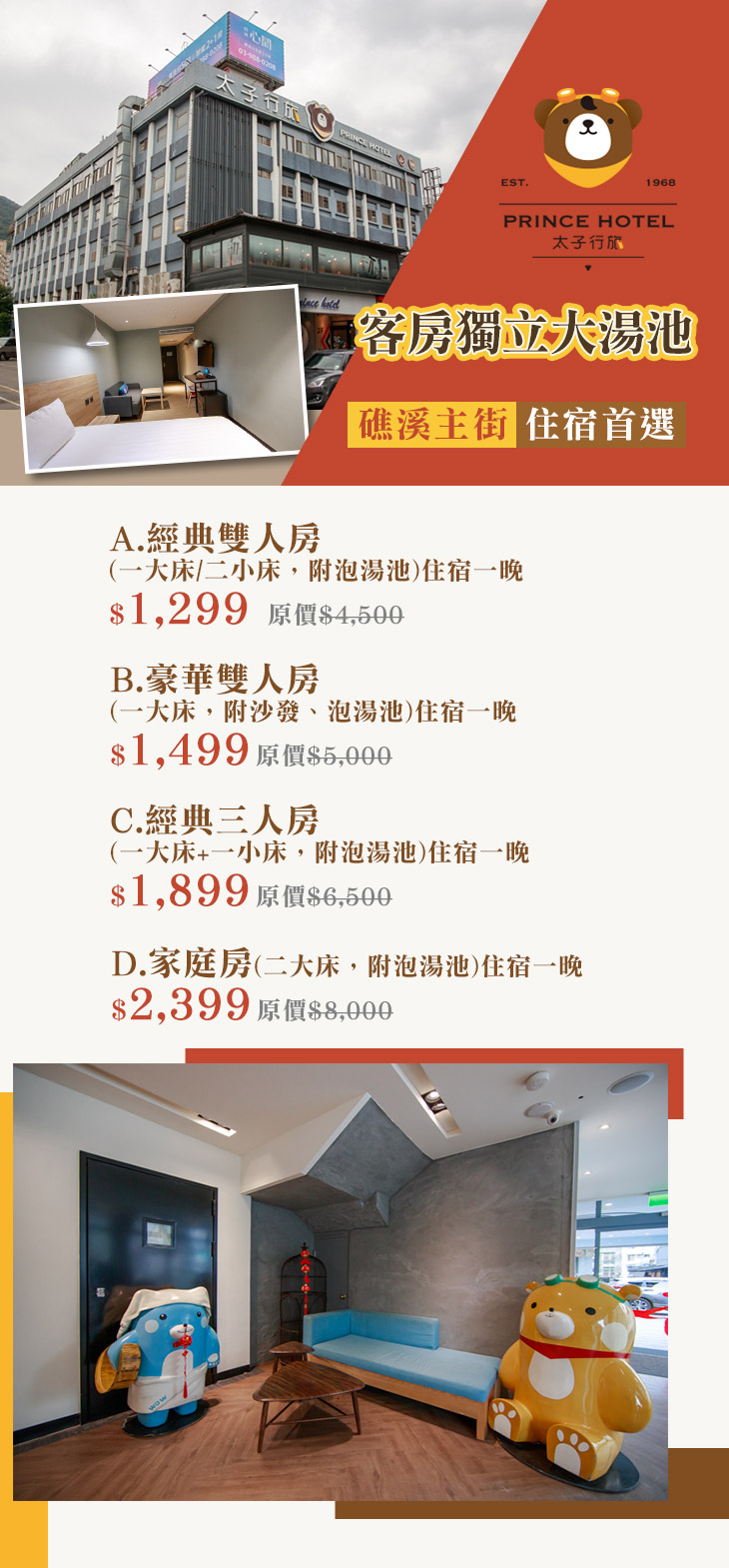 聽說,礁溪出現一隻手持風火輪及紅櫻槍的三太子熊熊!?整修翻新後全新上線的【太子行旅】,擺脫老牌飯店的既有形象,以簡約、清新的風格接待來往的旅客。位於礁溪溫泉中心地段,不管您是來旅遊、來洽公,休息之餘能夠享受溫泉的舒壓,輕鬆探索礁溪小鎮風情與自然風光美景。