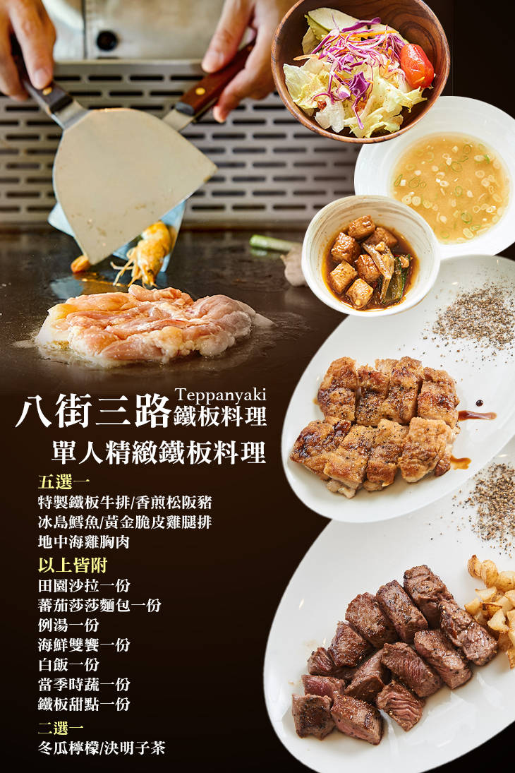 「走過八街,來到了三路!歡迎光臨【八街三路】!」明亮採光搭配挑高天花板設計,舒適、不壓迫!給人不同於一般鐵板料理餐廳的用餐心情。午後時分來到高雄前鎮區,雙腳走過、開車路過八條街,顧客陸陸續續聞香而來,準備好大快朵頤一番!食材嚴選新鮮、用料實實在在、廚藝技術專業!「客人來到鐵板料理餐廳用餐,除了讓飢腸轆轆的肚子能果腹一番,其中還有一項樂趣是欣賞主廚在料理台前,揮舞手藝的那一幕幕景象,不僅味蕾滿足,視覺上更享受!」本次與GOMAJI聯合釋出麻吉獨享優惠,機會難得,加緊把握!