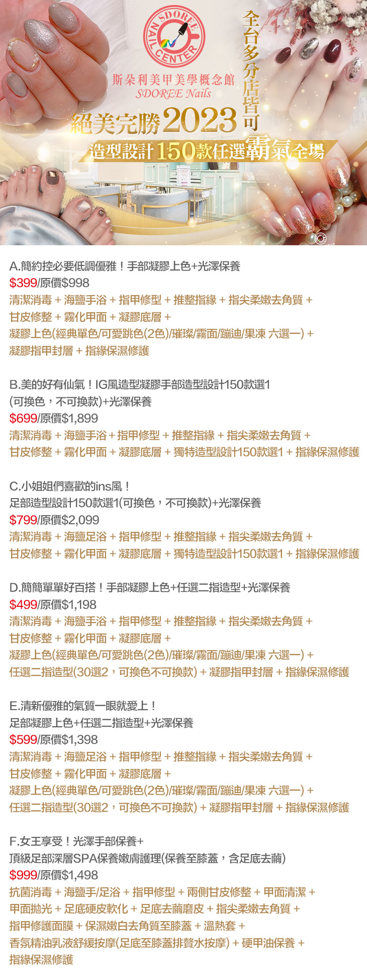 A.簡約控必要低調優雅!手部凝膠上色+光澤保養 / B.美的好有仙氣!IG風造型凝膠手部造型設計150款選1(可換色,不可換款)+光澤保養 / C.小姐姐們喜歡的ins風!足部造型設計150款選1(可換色,不可換款)+光澤保養 / D.簡簡單單好百搭!手部凝膠上色+光澤保養 / E.清新優雅的氣質一眼就愛上!足部凝膠上色+任選二指造型+光澤保養 / F.女王享受!光澤手部保養+頂級足部深層SPA保養嫩膚護理(保養至膝蓋,含足底去繭)