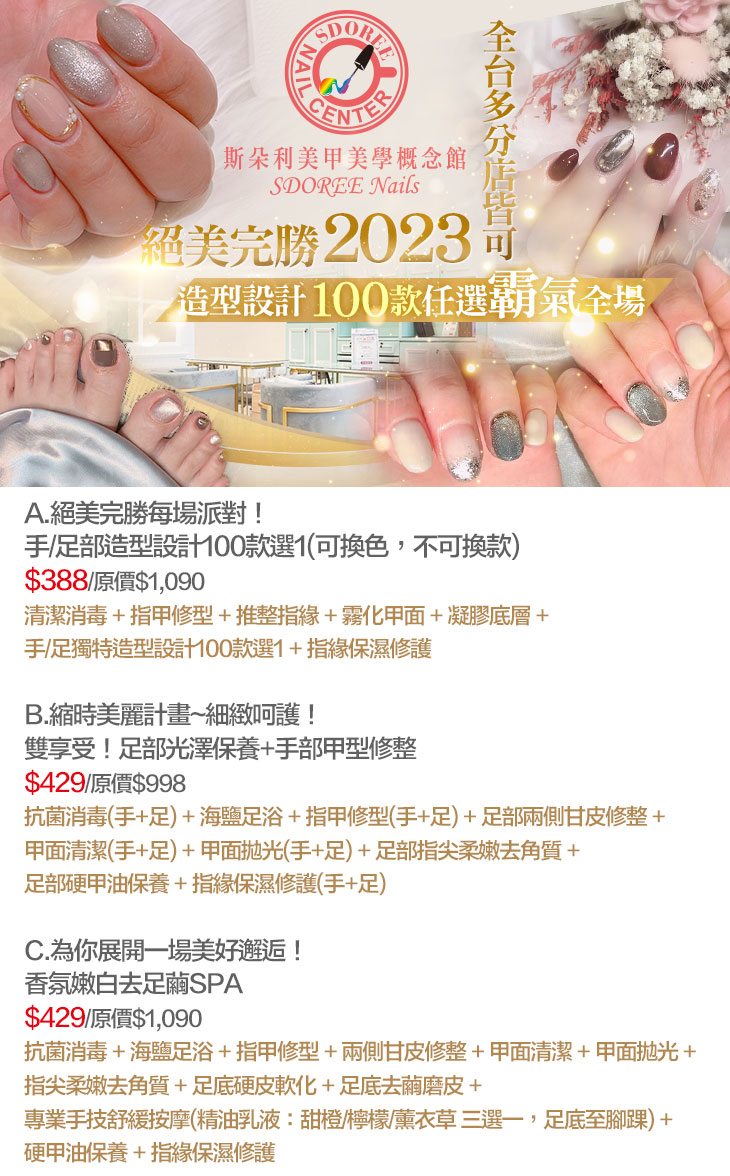 A.絕美完勝每場派對!手/足部造型設計100款選1(可換色,不可換款) / B.縮時美麗計畫~細緻呵護!雙享受!足部光澤保養+手部甲型修整 / C.為你展開一場美好邂逅!香氛嫩白去足繭SPA
