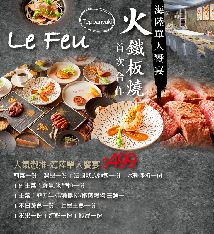〝Le Feu〞在法文的語意上,為「火」。您可以將它視為料理當中所用到的火,也可將它譯為對顧客服務熱情如火!近捷運大安站,步行約6分鐘!在東豐街這帶小有名氣的【Le Feu 鐵板燒】,為一間低調、平價的鐵板燒餐廳。