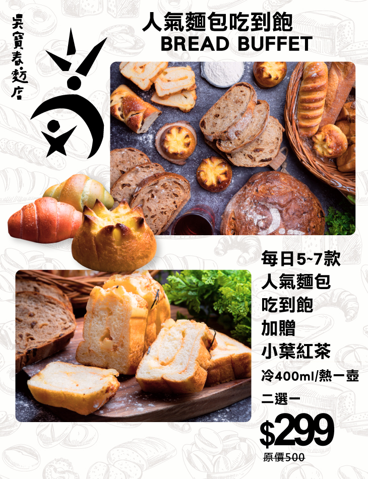 ➽ 吳寶春麥方店每日5~7款人氣麵包吃到飽,加贈小葉紅茶(冷400ml/熱一壺 二選一)