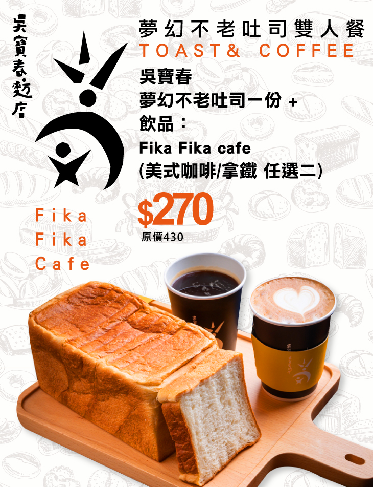 與【Fika Fika Cafe】聯手推出的咖啡飲品,讓麵包餐點的美味更上一層樓!來自嚴選咖啡豆的馥郁香氣,入口後變縈繞在齒唇之間、直撲鼻腔,醇厚的芬芳,讓人不禁放鬆沉浸其中,此時再來上一口【吳寶春麥方店(信義旗艦店)】的頂級美味,五星享受帶來幸福至極的時光!