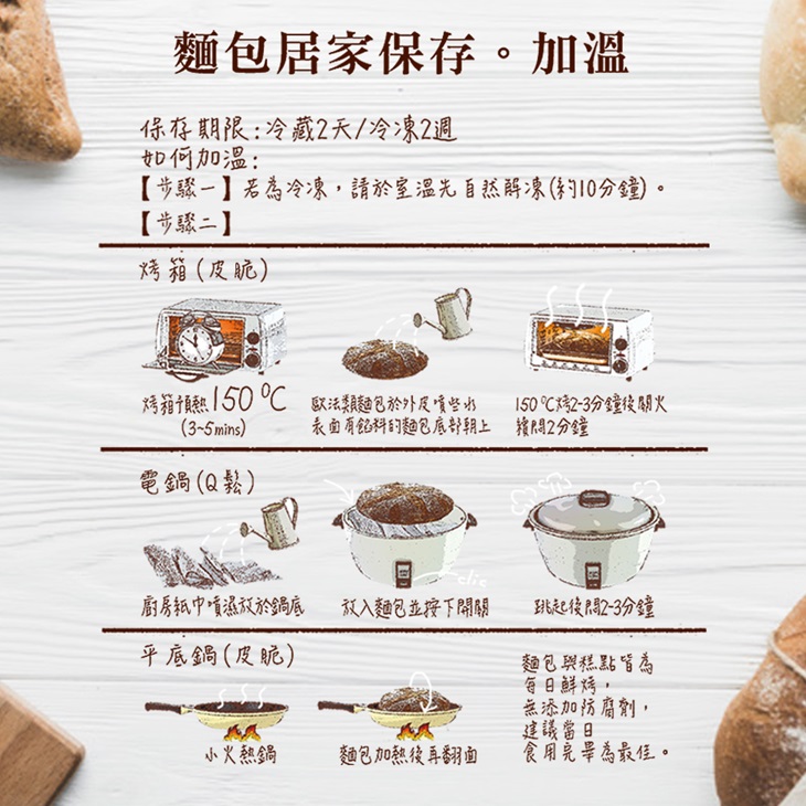 回溫方法:【冷凍】先室溫自然解凍(約10分鐘),選擇烤箱/電鍋/平底鍋進行加溫。