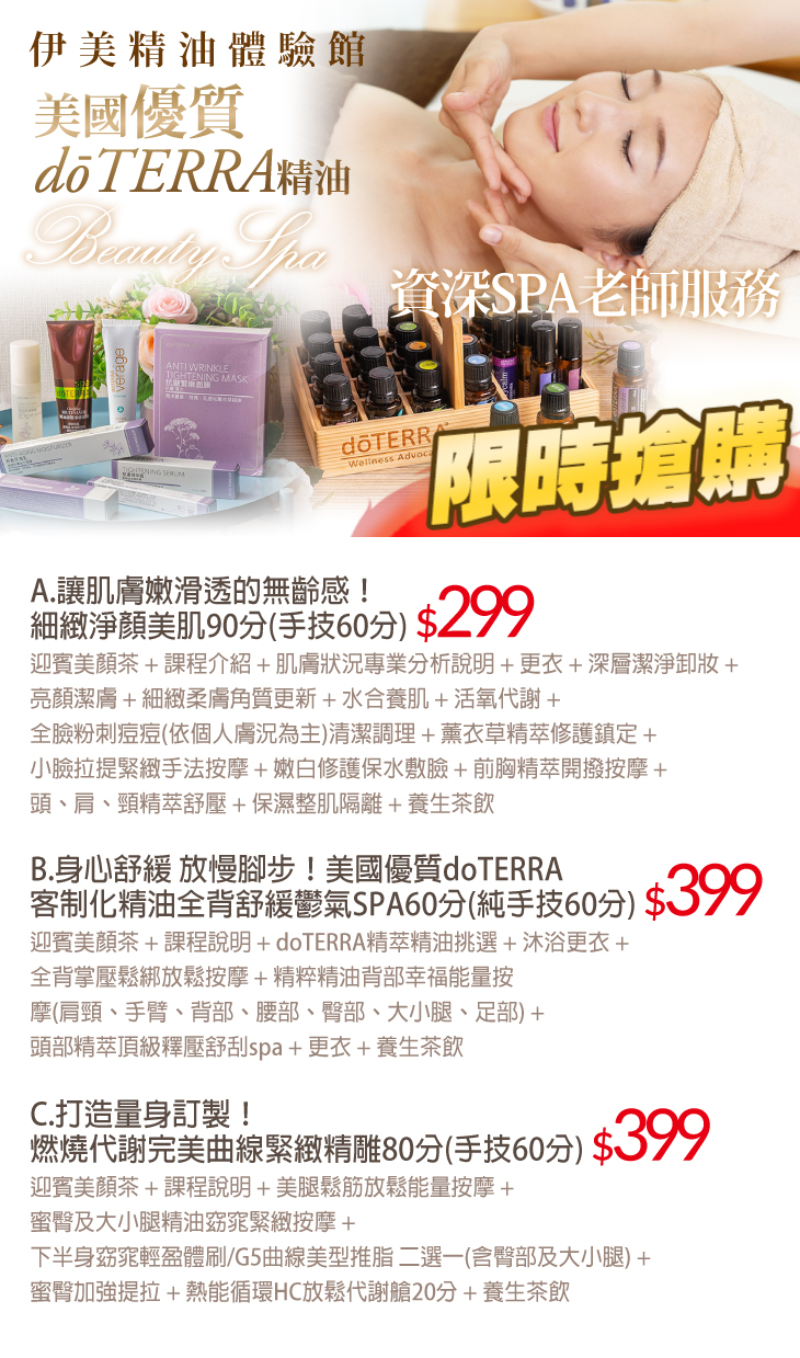 A.讓肌膚嫩滑透的無齡感!細緻淨顏美肌90分(手技60分) / B.身心舒緩 放慢腳步!美國優質doTERRA客制化精油全背舒緩鬱氣SPA60分(純手技60分) / C.打造量身訂製!燃燒代謝完美曲線緊緻精雕80分(手技60分)