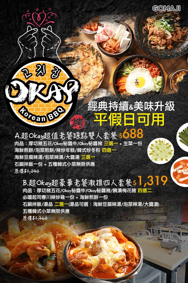 〈肉品:厚切豬五花/Okay秘醬牛/Okay秘醬豬 三選一 + 生菜一份 + 海鮮煎餅/泡菜煎餅/辣炒年糕/韓式炒冬粉 四選一 + 海鮮豆腐辣湯/泡菜辣湯/大醬湯 三選一 + 石鍋拌飯一份 + 五種韓式小菜無限供應〉