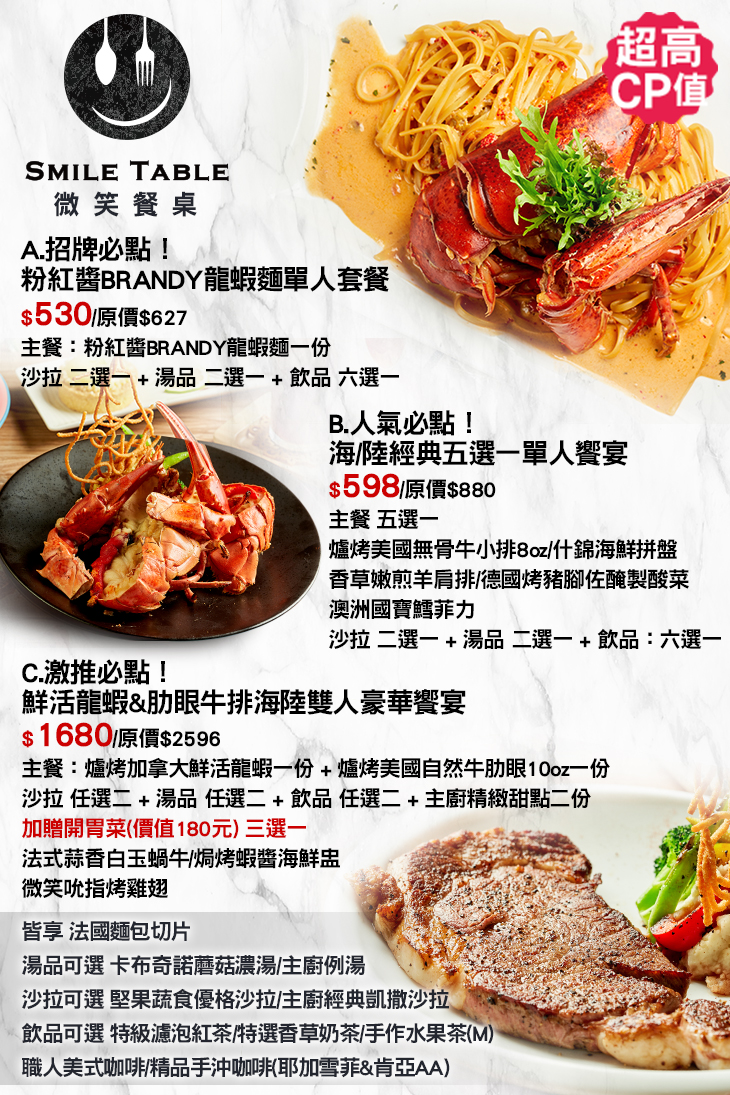 超好評店家!本次推出超值優惠套餐!近捷運南京三民站,交通便利周邊環境熱鬧,【SMILE TABLE 微笑餐桌】為一間質感西式餐廳,平實親民的價格,嚴選高級的食材,主廚用心料理餐點,店內招牌鮮活龍蝦,超高CP值,令人流連忘返!為您打造寬敞的舒適環境,店家專賣的不僅僅是料理餐點,同時也是一間'微笑專賣店',無價的微笑是親近彼此的連接點,希望突破以往對西餐及服務的距離感,不追求花俏與浮誇,注重的是溫暖彼此的熱度,期待與您在此處'微笑相遇',一同於餐桌上共襄盛舉!