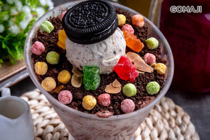 甜食控最愛的黑騎士來囉!綿密濃郁的巧克力雪花冰上,擺滿了一球超大冰淇淋、OREO餅乾、杏仁片及可愛的小熊軟糖,當然少不了滿滿香甜的特調巧克力粉,美味層層堆疊,吃起來香甜爽口,卻不會過於甜膩,每一口都讓人深深著迷!