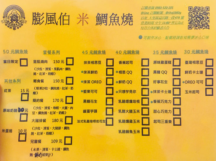 鯛魚燒(鮮奶卡士達、黑糖QQ、起司三重奏、鹹蛋芋頭、相思QQ)、簡約餐、大豬排餐