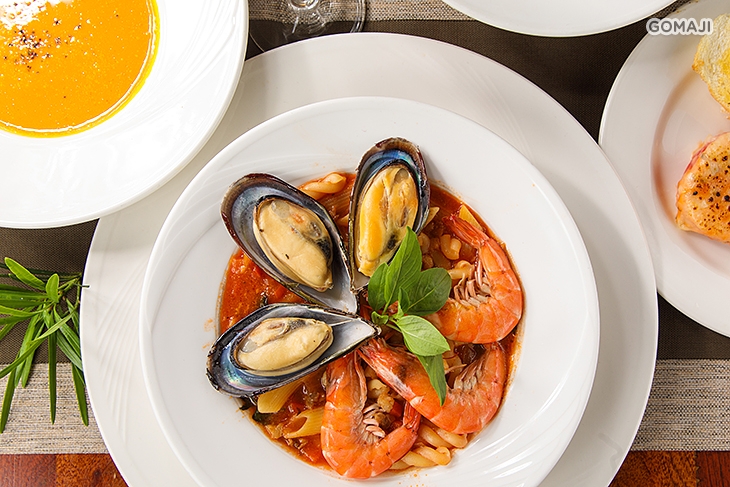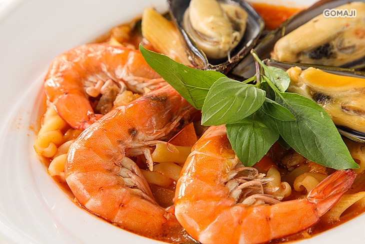 番茄的橘紅色澤渲染出如日落的美麗模樣,甜酸滋味伴隨著大海的鮮與香!甘美滋味在口中掀起海味的浪潮,層次豐富令人沉醉不已!