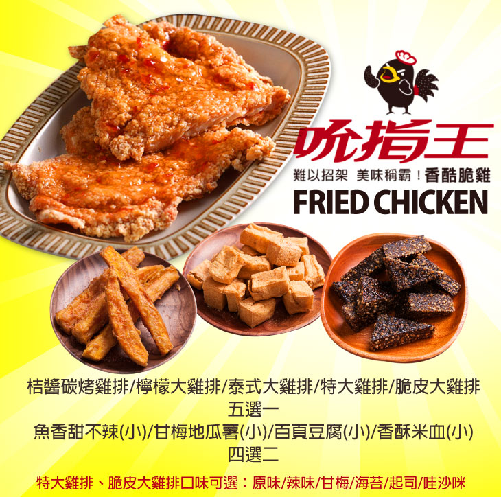 桔醬碳烤雞排/檸檬大雞排/泰式大雞排/特大雞排/脆皮大雞排 五選一 + 魚香甜不辣(小)/甘梅地瓜薯(小)/百頁豆腐(小)/香酥米血(小) 四選二,特大雞排、脆皮大雞排口味可選:原味/辣味/甘梅/海苔/起司/哇沙咪〉