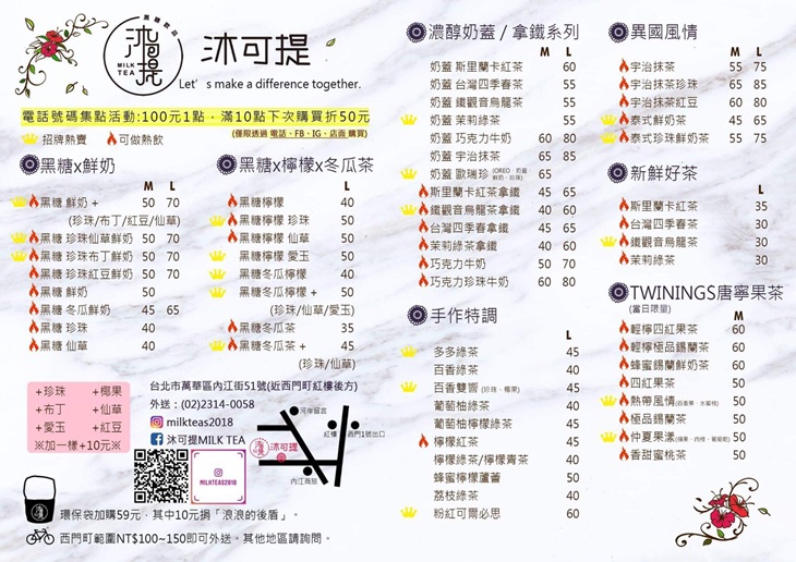 「Let's make a difference together.」因應市場潮流及季節變化的快速,【沐可提】不斷研發與創造新的特調飲品與茶飲,無論在視覺或味覺上都給予顧客滿滿的驚喜!