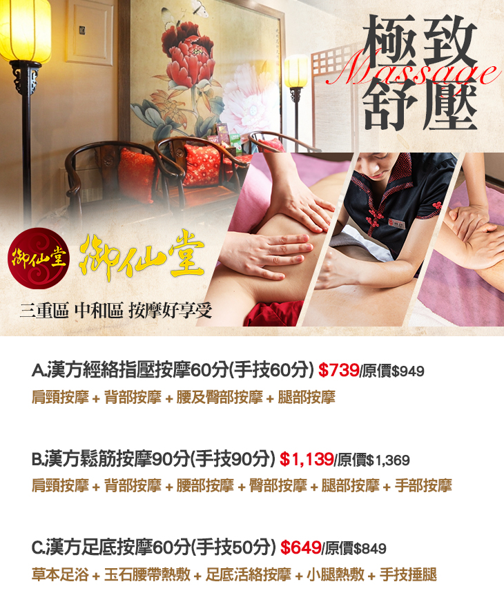 御仙堂為御手國醫之子企業,同以「源自中醫,專注養生」為理念,訴求極致的個人養生享受,並以亞健康調理為服務主軸。以中式古典風格為基調,並將人文、藝術、休閒概念集於一身,讓您如來到神秘佳境,提供漢方經絡指壓、油壓鬆筋等按摩服務,同時傳遞養生概念,讓您卸下一身的疲憊,沉浸在健康又舒適的療程中,重獲輕盈的體態與步伐。