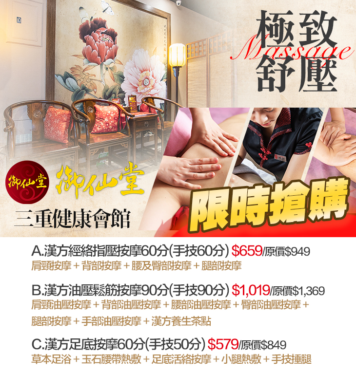 御仙堂為御手國醫之子企業,同以「源自中醫,專注養生」為理念,訴求極致的個人養生享受,並以亞健康調理為服務主軸。以中式古典風格為基調,並將人文、藝術、休閒概念集於一身,讓您如來到神秘佳境,提供漢方經絡指壓、油壓鬆筋等按摩服務,同時傳遞養生概念,讓您卸下一身的疲憊,沉浸在健康又舒適的療程中,重獲輕盈的體態與步伐。