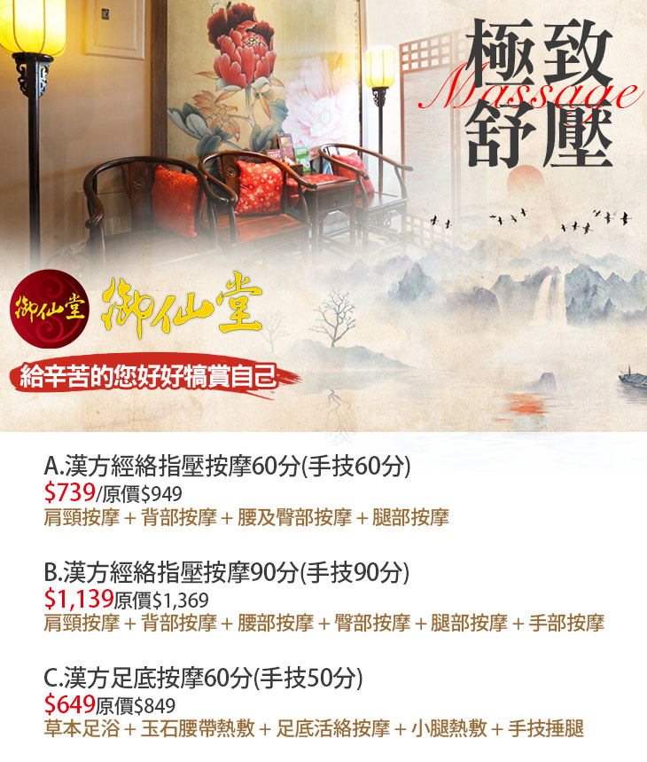 御仙堂為御手國醫之子企業,同以「源自中醫,專注養生」為理念,訴求極致的個人養生享受,並以亞健康調理為服務主軸。以中式古典風格為基調,並將人文、藝術、休閒概念集於一身,讓您如來到神秘佳境,提供漢方經絡指壓、油壓鬆筋等按摩服務,同時傳遞養生概念,讓您卸下一身的疲憊,沉浸在健康又舒適的療程中,重獲輕盈的體態與步伐。