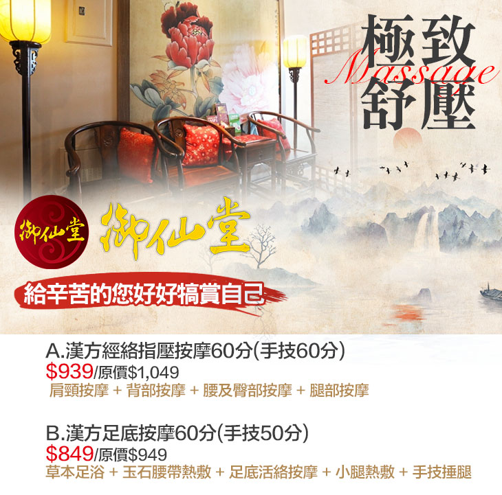 御仙堂為御手國醫之子企業,同以「源自中醫,專注養生」為理念,訴求極致的個人養生享受,並以亞健康調理為服務主軸。以中式古典風格為基調,並將人文、藝術、休閒概念集於一身,讓您如來到神秘佳境,提供漢方經絡指壓、油壓鬆筋等按摩服務,同時傳遞養生概念,讓您卸下一身的疲憊,沉浸在健康又舒適的療程中,重獲輕盈的體態與步伐。