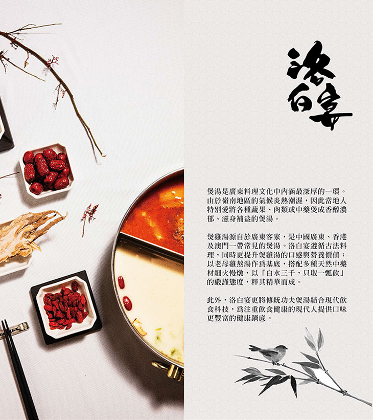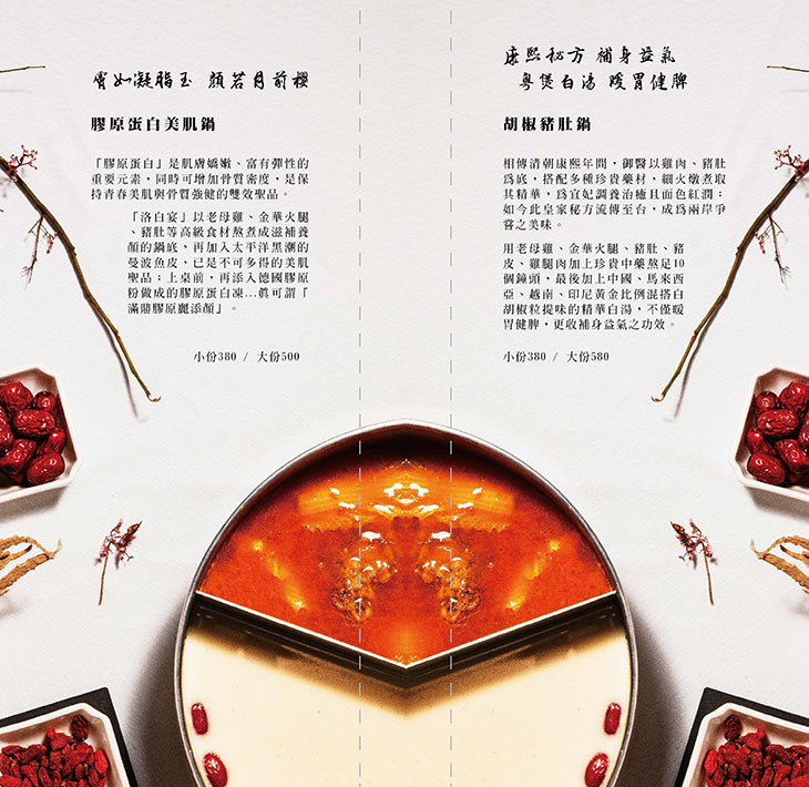 「洛白宴」以老母雞、金華火腿、豬肚等高級食材熬煮成滋補養顏的鍋底,再加入太平洋 黑潮的曼波魚皮,已是不可多得的美肌聖品 ; 上桌前,再添入德國膠原粉做成的膠原蛋白 凍...真可謂「滿鼎膠原麗添顏」。