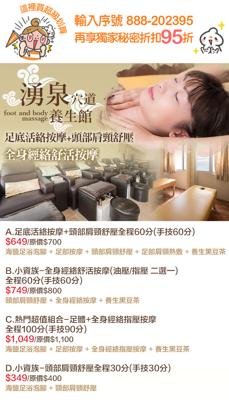 C.熱門超值組合-足體+全身經絡指壓按摩全程100分(手技90分)