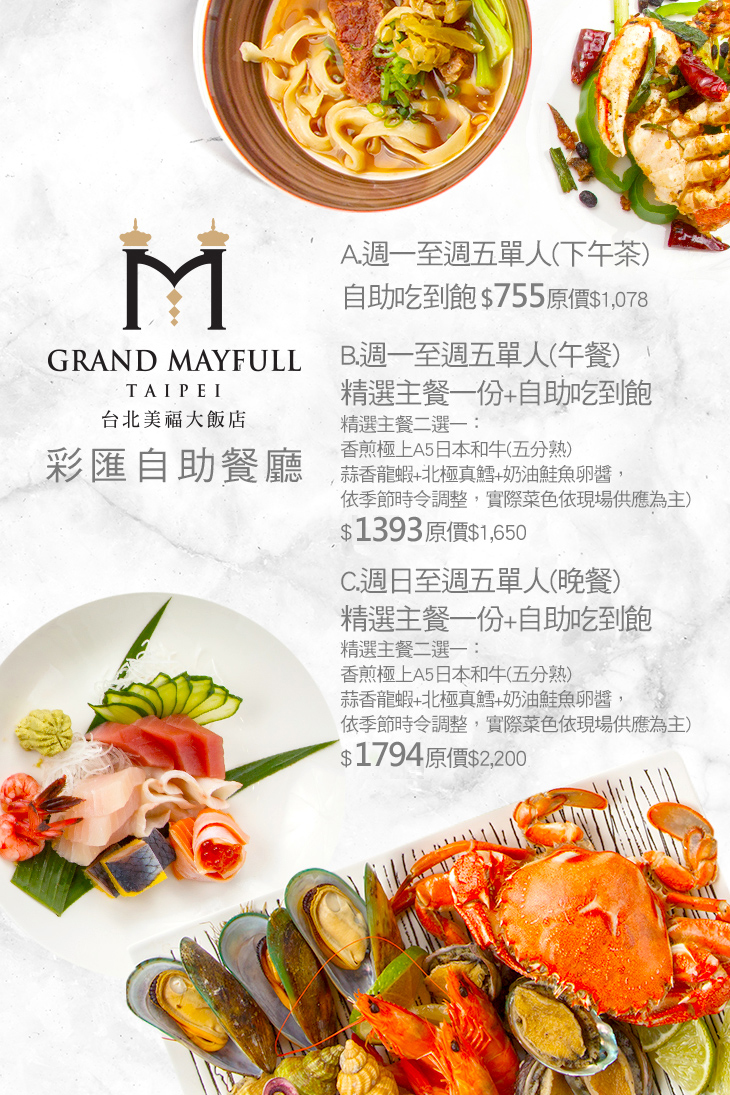 ※ 自助式餐檯菜色內容及B、C方案精選主餐皆依季節時令調整,實際菜色依飯店現場供應為主。