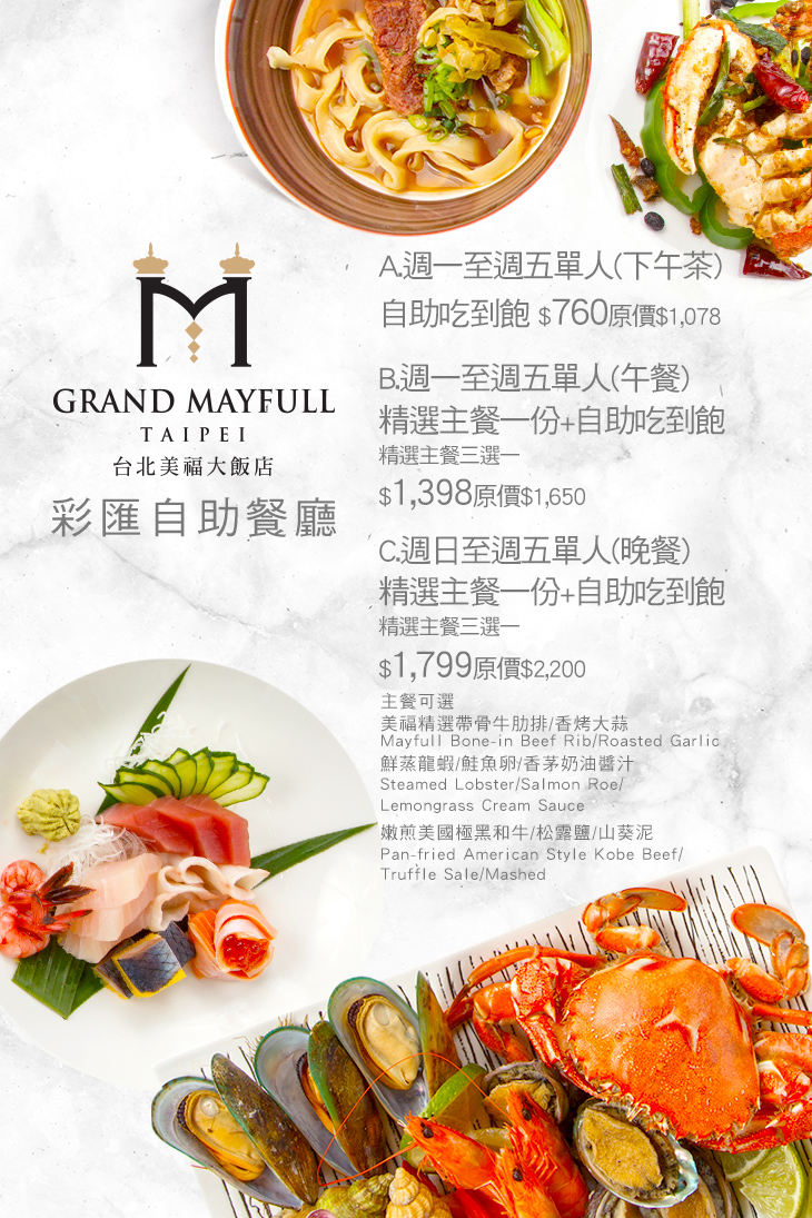 A.週一至週五單人(下午茶)自助吃到飽(5/31前僅營業週五至週日,假日使用不加價) / B.週一至週五單人(午餐)精選主餐一份+自助吃到飽(5/31前僅營業週五至週日,假日使用不加價) / C.週日至週五單人(晚餐)精選主餐一份+自助吃到飽(5/31前僅營業週五至週日,假日使用不加價)