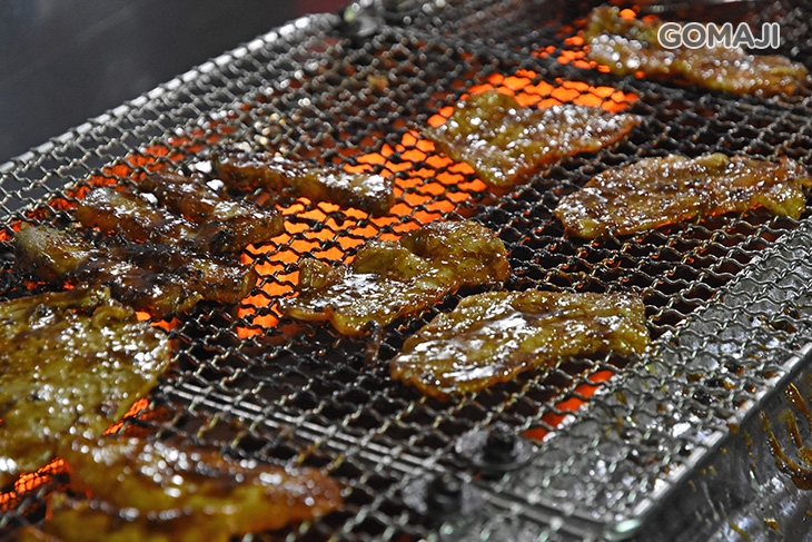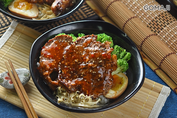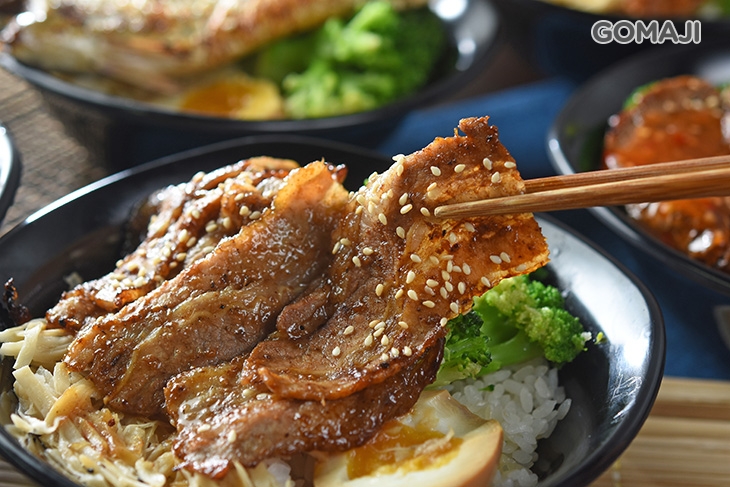 堅持現烤的烤燒肉飯,刷上自製烤肉醬、慢火翻烤的肉片,肉汁與醬汁相伴流出在烤盤上不停的滋滋作響 ~ 最後撒上一點白芝麻提香點綴,真是美味極了!