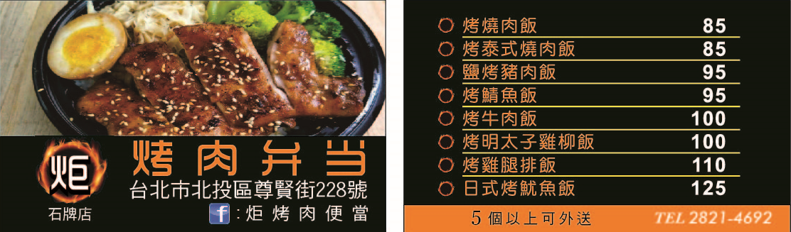分別在安坑及石牌區皆有設店的炬烤肉弁当,每到了用餐時間總是門庭若市,有多款精緻美味的烤肉飯可以讓您挑選 ~ 讓午、晚餐還想不到吃什麼的您,可以有新的嘗試與選擇喲!