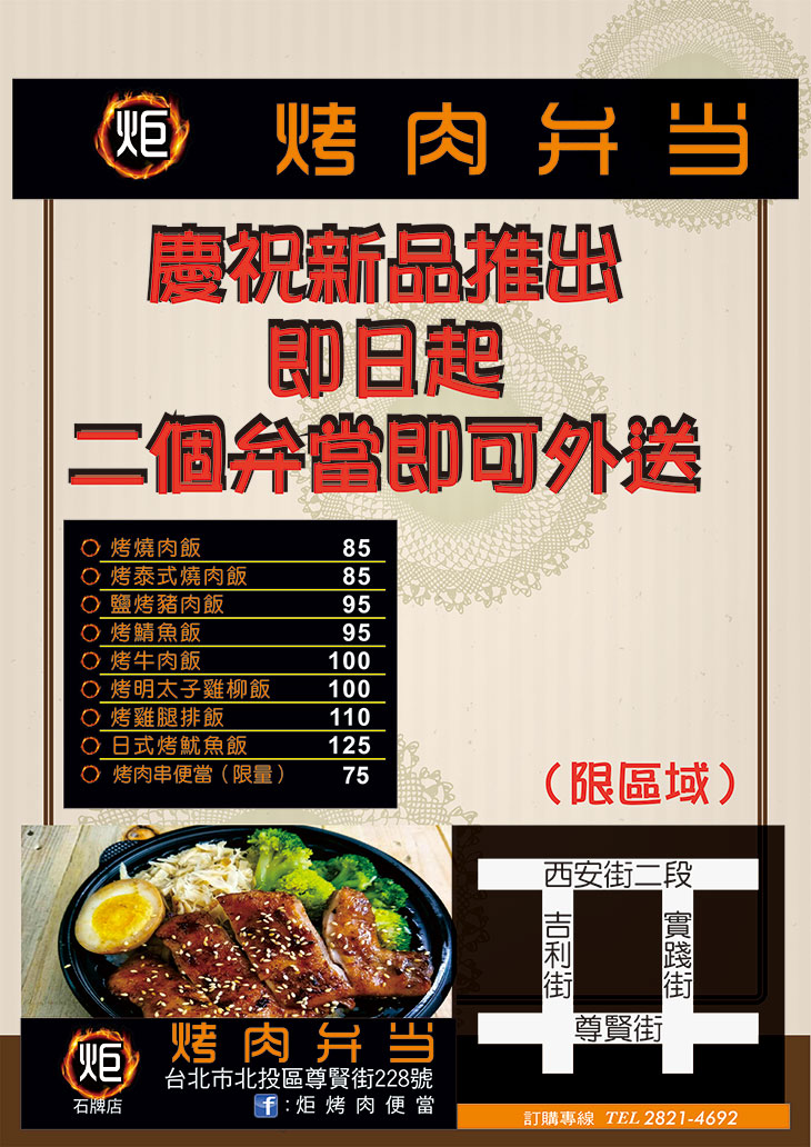 分別在安坑及石牌區皆有設店的炬烤肉弁当,每到了用餐時間總是門庭若市,有多款精緻美味的烤肉飯可以讓您挑選 ~ 讓午、晚餐還想不到吃什麼的您,可以有新的嘗試與選擇喲!