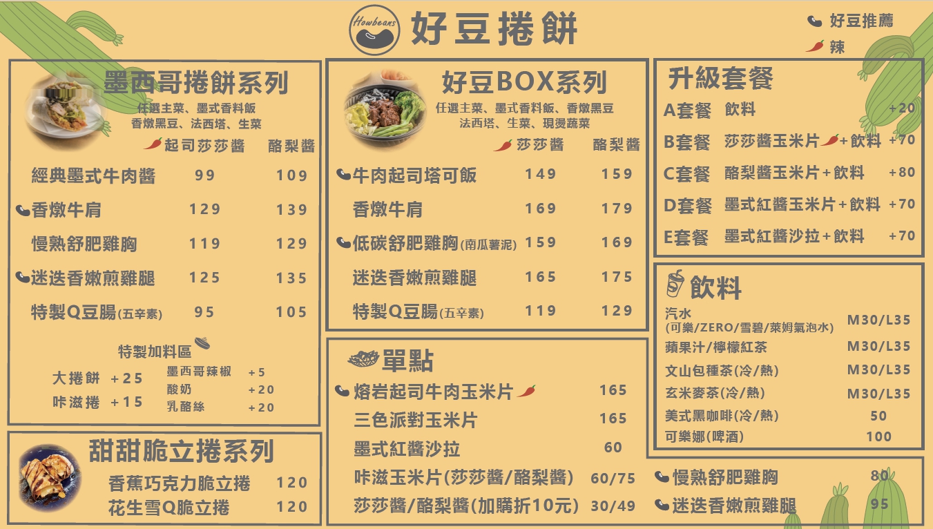 【好豆捲餅】販售的餐點有墨西哥捲餅、墨西哥式餐盒以及玉米片,豐富的品項,每嚐一口都是驚喜!老闆在赴美國旅遊的過程中,品嚐了美味的墨式街頭小吃,除了美味又方便之外,相較於一般常見的速食也更健康,因此希望將這記憶中的味道帶回國,分享給更多台灣朋友!而為什麼叫做好豆呢?因為店內的餐點中都有添加”黑豆”這個原料,黑豆不只可以提供飽足感,營養價值也非常高,可以說是墨西哥捲餅中的靈魂唷!想要體驗美味又營養的墨式風味料理嗎?現在到好豆捲餅來個一捲吧 ~ 保證讓您一吃成主顧,意猶未盡!