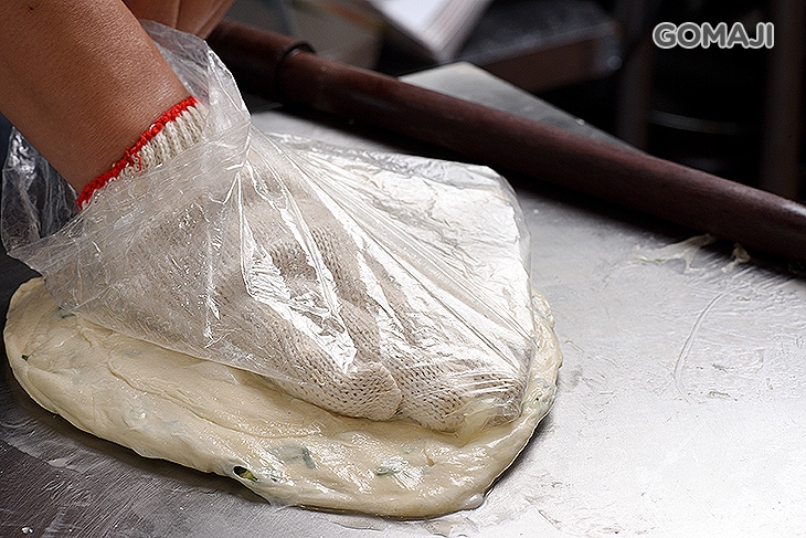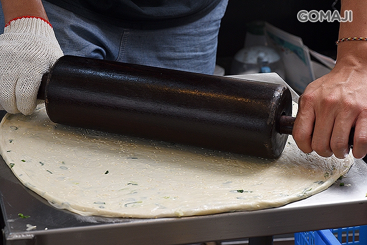 老闆以恰到好處的力道將餅皮滾至適當的厚度,讓餅皮呈現均勻細緻的樣貌。