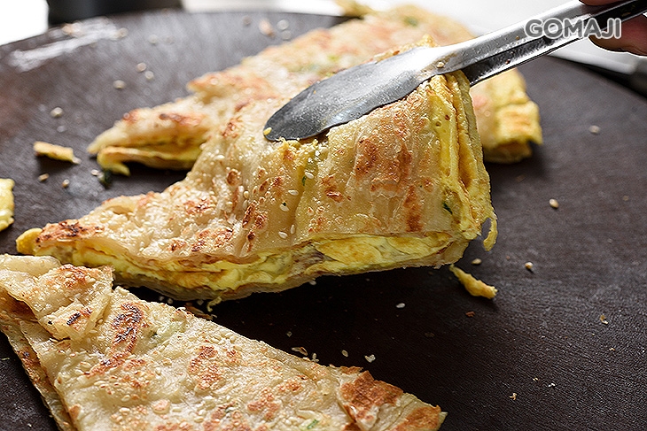 老闆以嫻熟的手藝將芝麻蔥油餅煎至微焦香脆、渾厚鹹香,也可依個人喜好選擇加蛋唷~