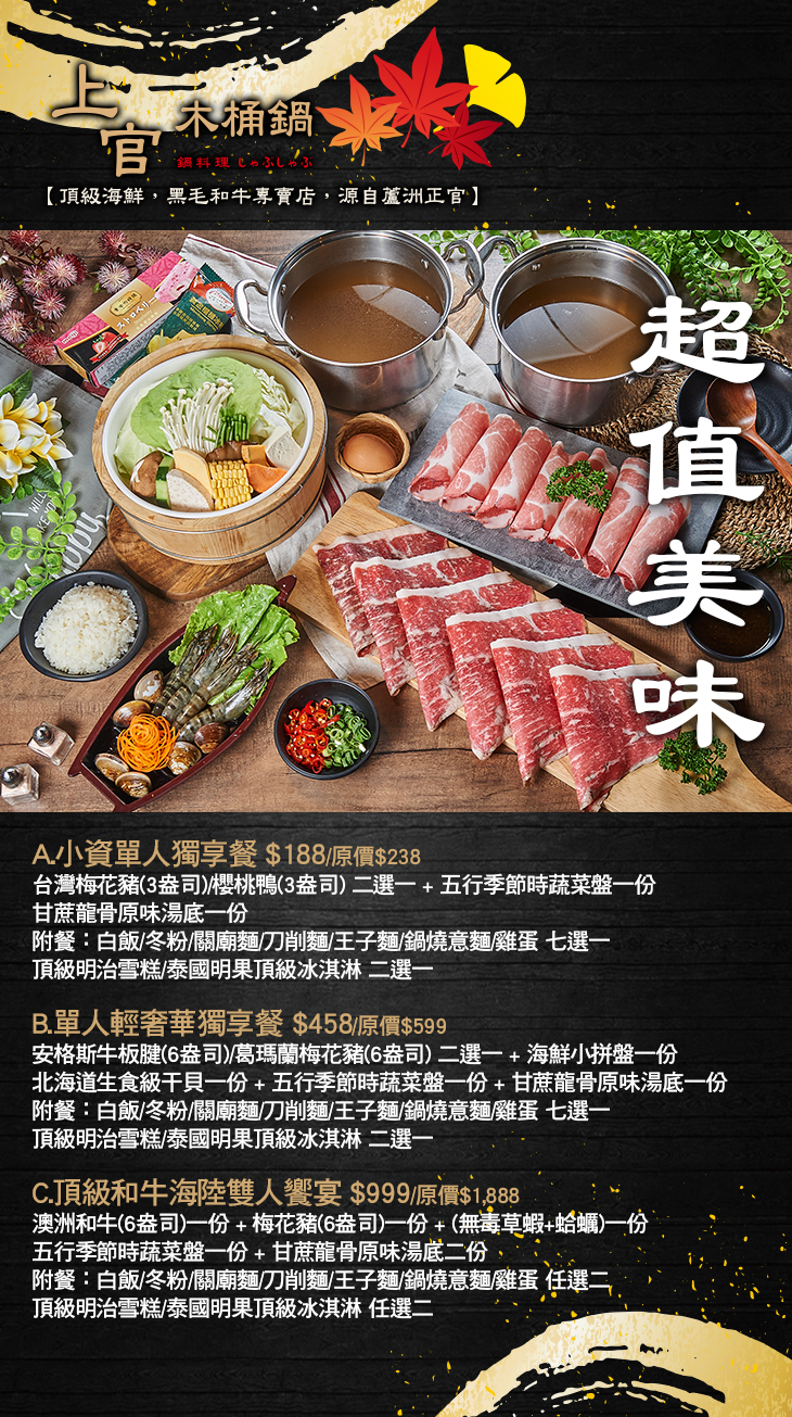 源自蘆洲正官木桶鍋,最熱門的涮涮鍋!以顧客的健康為出發點,嚴選食材與湯頭,上等大骨佐以甘蔗蔬果以及柴魚風味調料淬煉熬製出濃醇湯頭,華麗的襯托出各種嚴選食材的本味,並採用最頂級優質的肉品,歡迎闔家光臨,享受一場味蕾的盛宴。