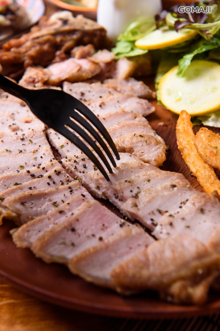 挑選肉質鮮嫩肥美的戰斧丁骨豬排,透過香煎調理,將豬肉的鮮甜慢慢逼出,同時也過濾掉多餘的油脂,切片擺盤上桌,豐盛的配菜,讓豬排看起來色香味俱全,香鹹氣息撲鼻而來,讓人迫不及待想大快朵頤。