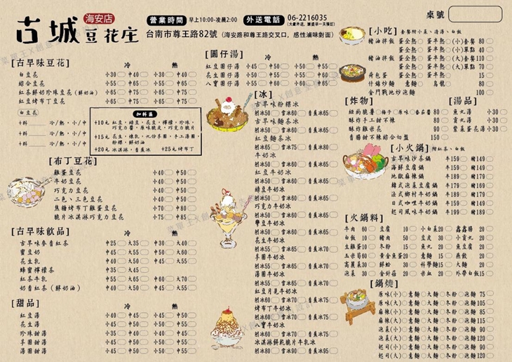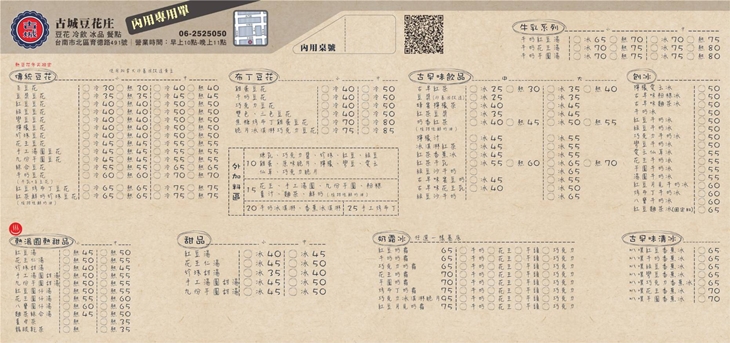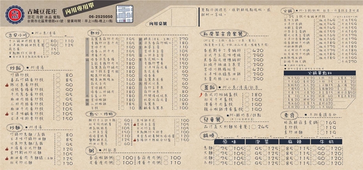 古城豆花庄不只擁有豐富口味的豆花甜品,更是提供了多樣菜單,各種菜色不怕您挑,想吃什麼都找得到,就像從前阿嬤總是能將您思思念念的糖果零嘴變出來般,既然我們回不去過去的年代,那麼至少,在「食」的部份,古城豆花庄為您守護,在這裡,您可以慢慢享用一份美食佳餚,並靜靜品味永不褪色的兒時記憶。