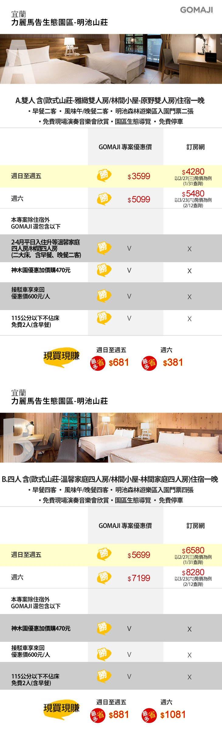 別擔心!GOMAJI團隊聽到各位麻吉您的心聲啦!本次力麗觀光連鎖 - 【明池山莊】聯合推出超值強檔住宿優惠,除了提供既舒適又放鬆、以大自然與花草樹林為舞的優質房型,更推出一系列園區周邊服務與特色活動,讓您不用煩惱旅遊行程的安排,只要服裝一換、行囊準備好,隨時隨地即可出發!看到這裡,是不是有點心動了呀!別在手機、電腦前猶豫不決啦!趕緊打開行事曆,把時間空下來吧!