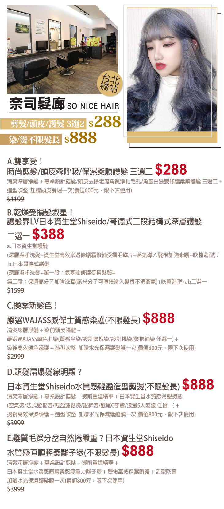 A.雙享受!時尚剪髮/頭皮森呼吸/保濕柔順護髮 三選二 / B.乾燥受損髮救星!護髮界LV日本資生堂Shiseido/哥德式二段結構式深層護髮 二選一 / C.換季新髮色!嚴選WAJASS威傑士質感染護(不限髮長) / D.頭髮扁塌髮線明顯?日本資生堂Shiseido水質感輕盈造型剪燙(不限髮長) / E.髮質毛躁分岔自然捲嚴重?日本資生堂Shiseido水質感直順輕柔離子燙(不限髮長)