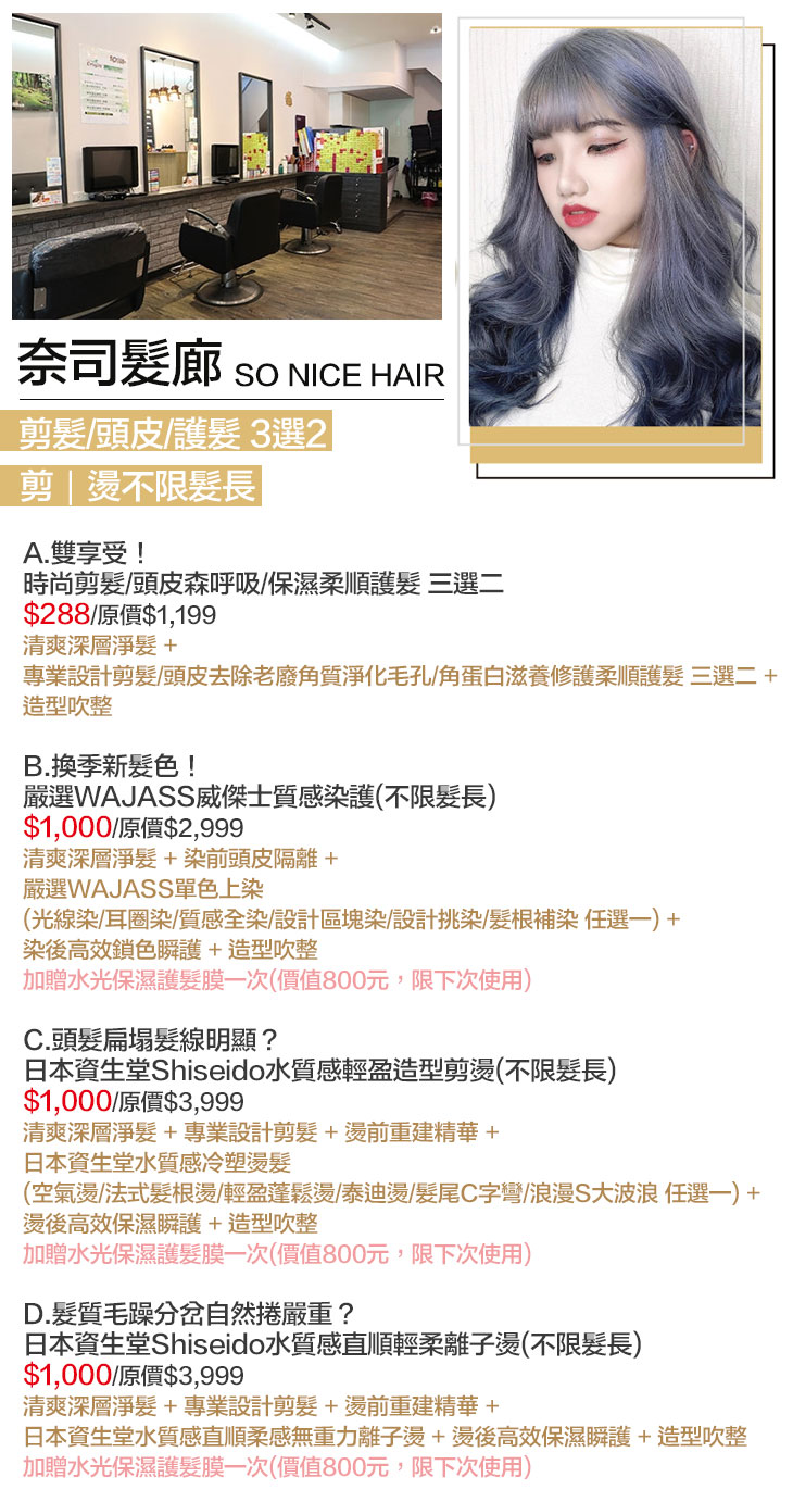 A.雙享受!時尚剪髮/頭皮森呼吸/保濕柔順護髮 三選二 / B.換季新髮色!嚴選WAJASS威傑士質感染護(不限髮長) / C.頭髮扁塌髮線明顯?日本資生堂Shiseido水質感輕盈造型剪燙(不限髮長) / D.髮質毛躁分岔自然捲嚴重?日本資生堂Shiseido水質感直順輕柔離子燙(不限髮長)