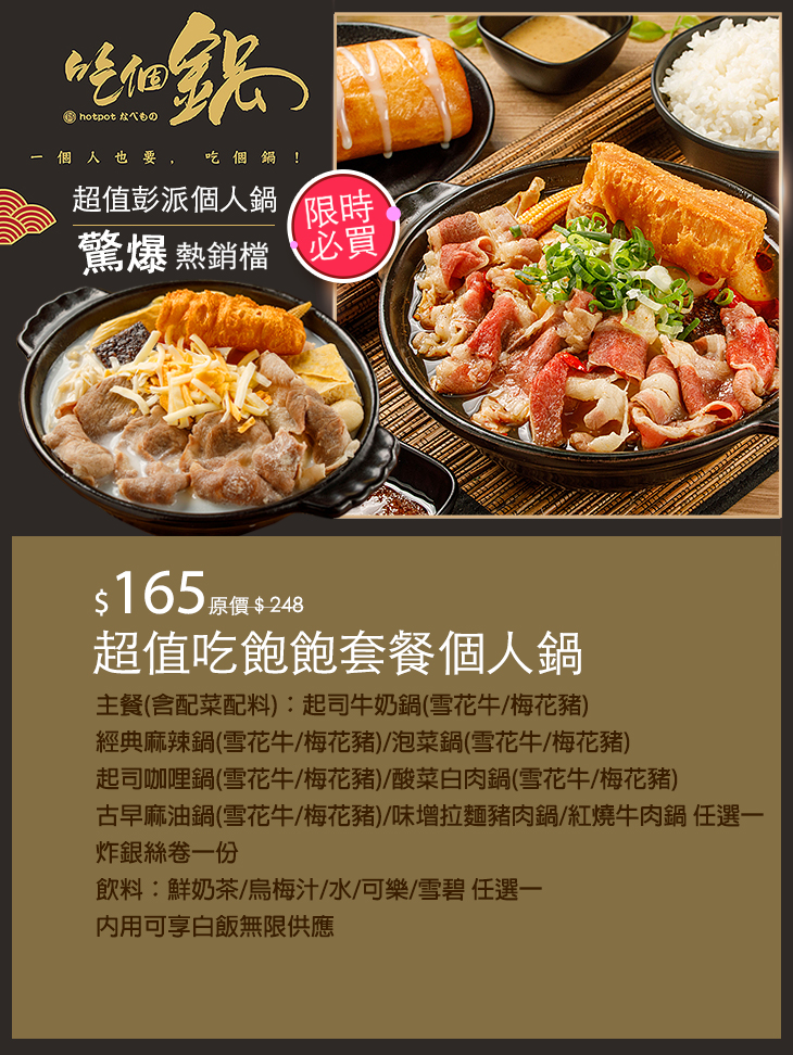 近捷運台電大樓站3號出口!【吃個鍋】是師大商圈擁有親民價格、高級質感裝潢、超澎湃份量的百元鍋物!主要推薦單人鍋物,「就算是一個人也可吃個鍋」帶給您精巧,好外帶的精緻小火鍋,讓一般獨身貴族、小資族、繁忙的上班族多了一間好去處!特別的是,店家會先為您烹煮火鍋,一端上桌即可享用,又快又方便,顛覆一般自助式小火鍋的繁瑣工序,本次推出超值個人鍋套餐,平假日皆可使用,獨家優惠不容錯過!