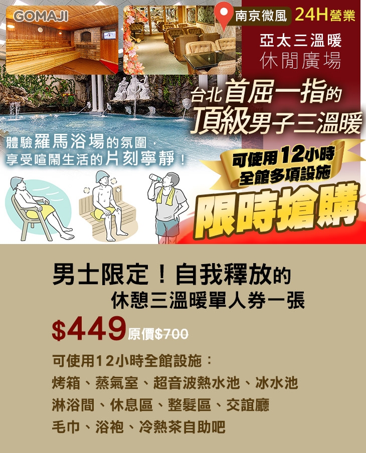 台北首屈一指的頂級男子三溫暖!無法出國去歐洲,就來【亞太三溫暖休閒廣場】體驗羅馬浴場的氛圍,享受都市喧鬧生活的片刻寧靜吧!走入接待大廳,彷彿置身富麗堂皇的宮殿,在親切服務人員引導下,讓您卸下所有疲憊與壓力,盡情享受美好、放鬆的三溫暖之旅!這裡備有多項養生休閒設備,三溫暖內包括有SPA池、蒸氣室、烤箱及冷熱茶自助吧,讓惱人的喧囂隨著霧氣蒸騰,恣意的享受這無與倫比的雅致體驗!