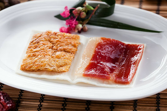 【彭園】特別設計發明的招牌菜,一定要品嚐到的經典料理!取用火腿最精華的部位,經三次慢火蒸透後,再以蜜汁醬醃漬;素方則採用精選豆腐皮,裹上開陽及蔬菜泥後酥炸。用麵皮包裹後入口,每一口都可感受酥軟甜鹹多種對比的好滋味!