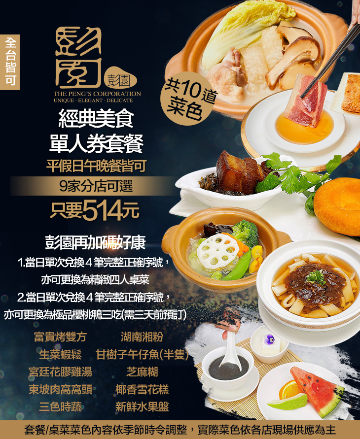 集結彭園會館新湘菜特色與經典菜色而成的個人美食套餐,其中頂級食材 加上老師傅的烹飪手法,使得每一道菜都是經典、吃每一口都讓人回味,更讓饕客以經濟實 惠的價格品嚐到高貴的美味佳餚。
