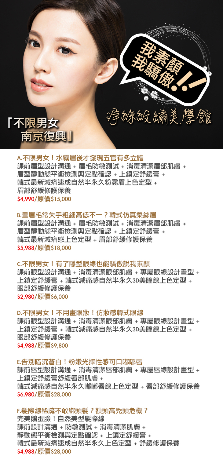 A.不限男女!水霧眉後才發現五官有多立體 / B.畫眉毛常失手粗細高低不一?韓式仿真柔絲眉 / C.不限男女!有了隱型眼線也能驕傲說我素顏 / D.不限男女!不用畫眼妝!仿妝感韓式眼線 / E.告別暗沉蒼白!粉嫩光擇性感可口嘟嘟唇 / F.髮際線稀疏不敢綁頭髮?額頭高禿頭危機?完美鵝蛋臉!自然美型髮際線
