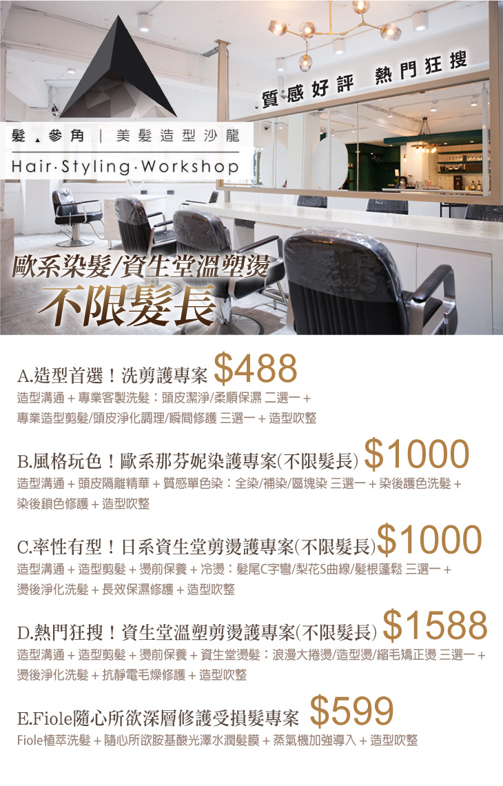 A.造型首選!洗剪護專案 / B.風格玩色!歐系那芬妮染護專案(不限髮長) / C.率性有型!日系資生堂剪燙護專案(不限髮長) / D.熱門狂搜!資生堂溫塑剪燙護專案(不限髮長) / E.Fiole隨心所欲深層修護受損髮專案