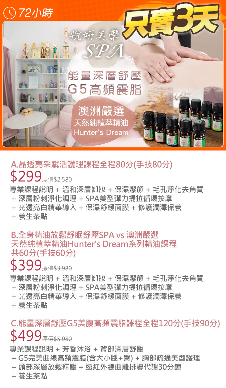 A.晶透亮采賦活護理課程全程80分(手技80分) / B.全身精油放鬆舒眠舒壓SPA vs 澳洲嚴選天然純植萃精油Hunter's Dream系列精油課程共60分(手技60分) / C.能量深層舒壓G5美腹高頻震脂課程全程120分(手技90分)